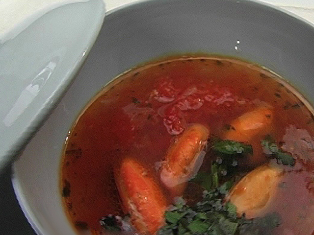 Изысканное блюдо из мидий.Состав:мидии — 8 штук;рыбный бульон — 400 гр;томаты — 5 штук;лук — 1/2 штуки;чеснок — 1 зубчик;смесь перцев, морская соль, петрушка, базилик, оливковое масло — по вкусу.